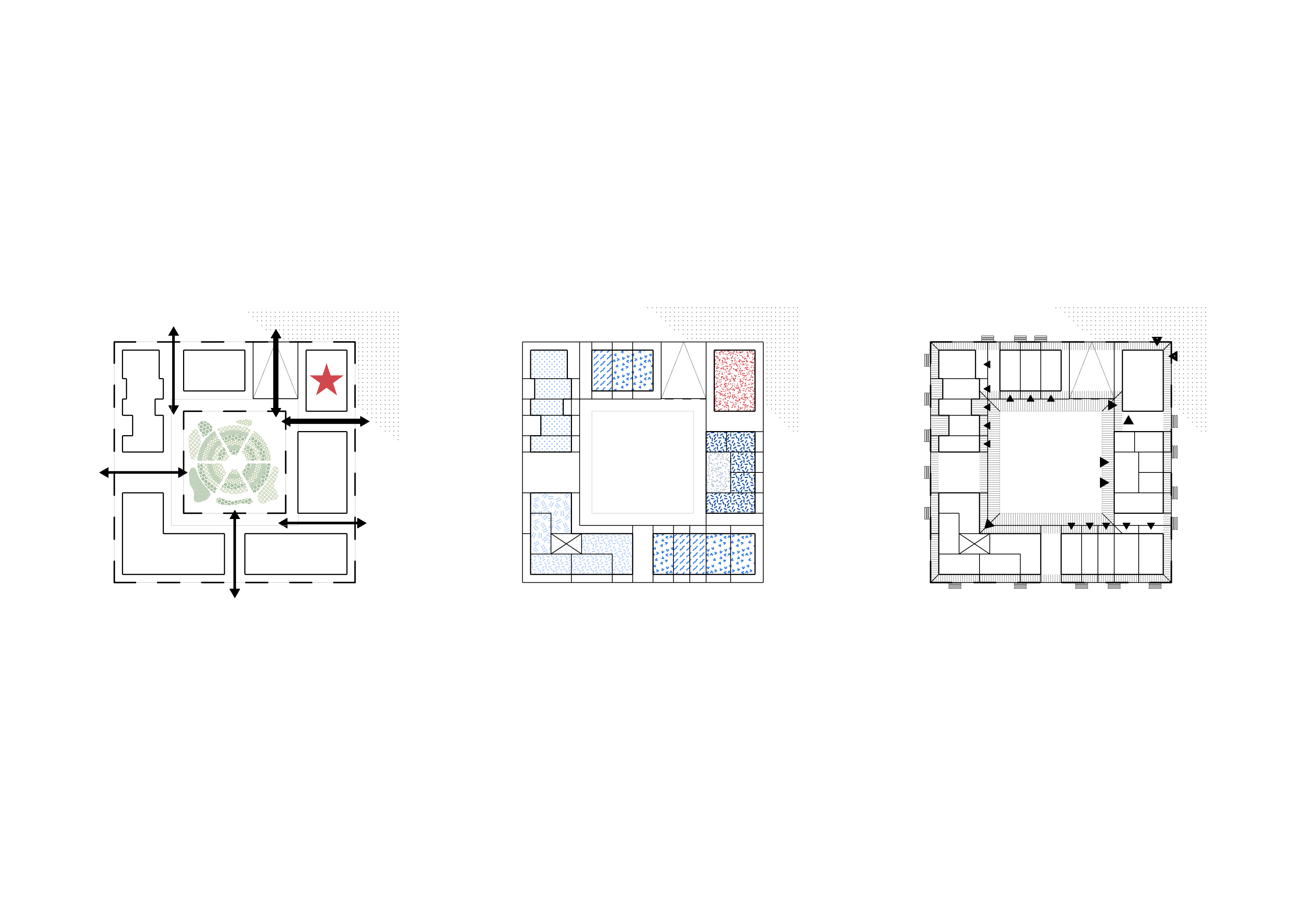 To ensure social dynamics and attractiveness for different social groups a selection of diverse housing typologies are selected and mixed in the project. Each courtyard is composed of different types of units: self-built houses, row houses, apartments and smaller studios with various degrees of shared, collective amenities. They vary in size and relation with the
